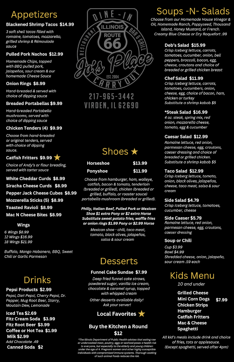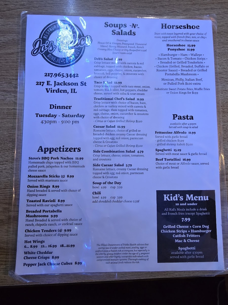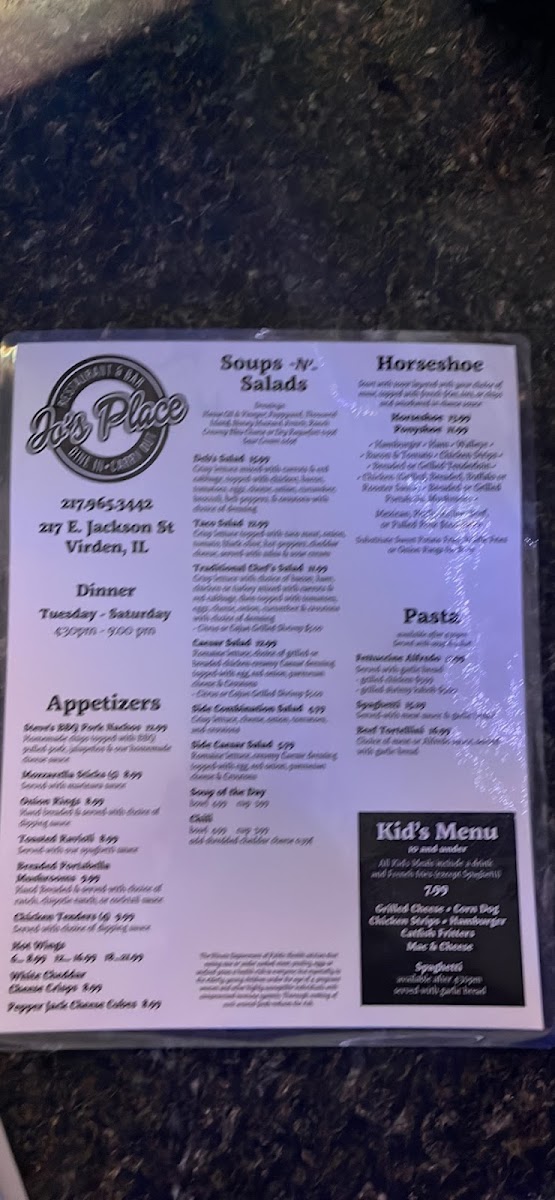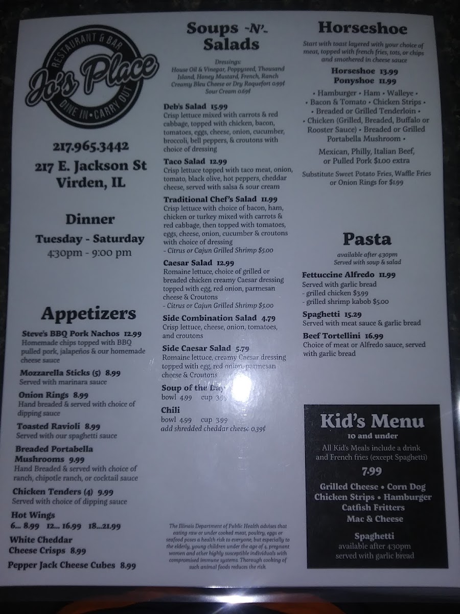 At Jo's Place Menu, located at 217 E Jackson St in Virden, IL, you'll find a variety of delicious dishes perfect for every craving. Whether you're in the mood for something comforting like a hearty burger or craving lighter options like fresh salads, there's something for everyone here. Their menu brings together the best of home-style cooking and bold flavors, with a focus on quality ingredients that will leave you coming back for more. Whether you’re grabbing a quick bite or enjoying a meal with friends, you’ll feel right at home. From savory appetizers to satisfying main courses, Jo's Place Menu offers everything you need for a great dining experience. It’s the kind of spot where each dish is crafted with care, ensuring a meal you’ll savor.